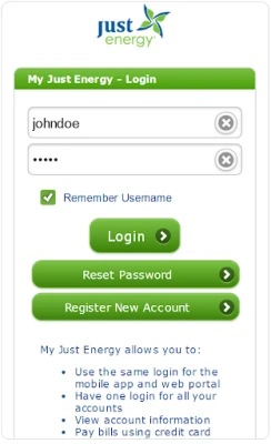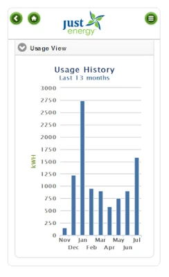 My Just Energy app offers access to view/pay bills, monthly usage & payment history through your phone or tablet device. To get started, download the app and sign in with your "My Just Energy" username and password.