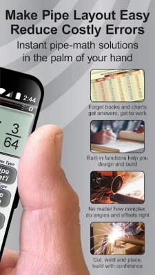 Introducing the Pipe Trades Pro Calculator, a revolutionary app designed for Android smartphones and tablets, tailored specifically for professionals in the pipe trades industry. This powerful tool simplifies complex pipe layout and design calculations, enabling pipefitters, steamfitters, sprinkler fitters, and welders to focus more on practical tasks like cutting, welding and placing pipes. The app's advanced features are engineered to save time and enhance accuracy, making it an indispensable tool for anyone in the field.